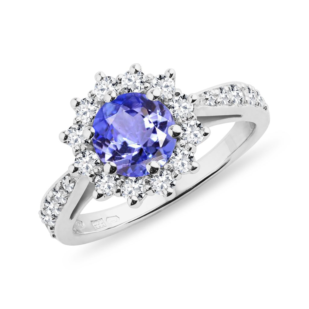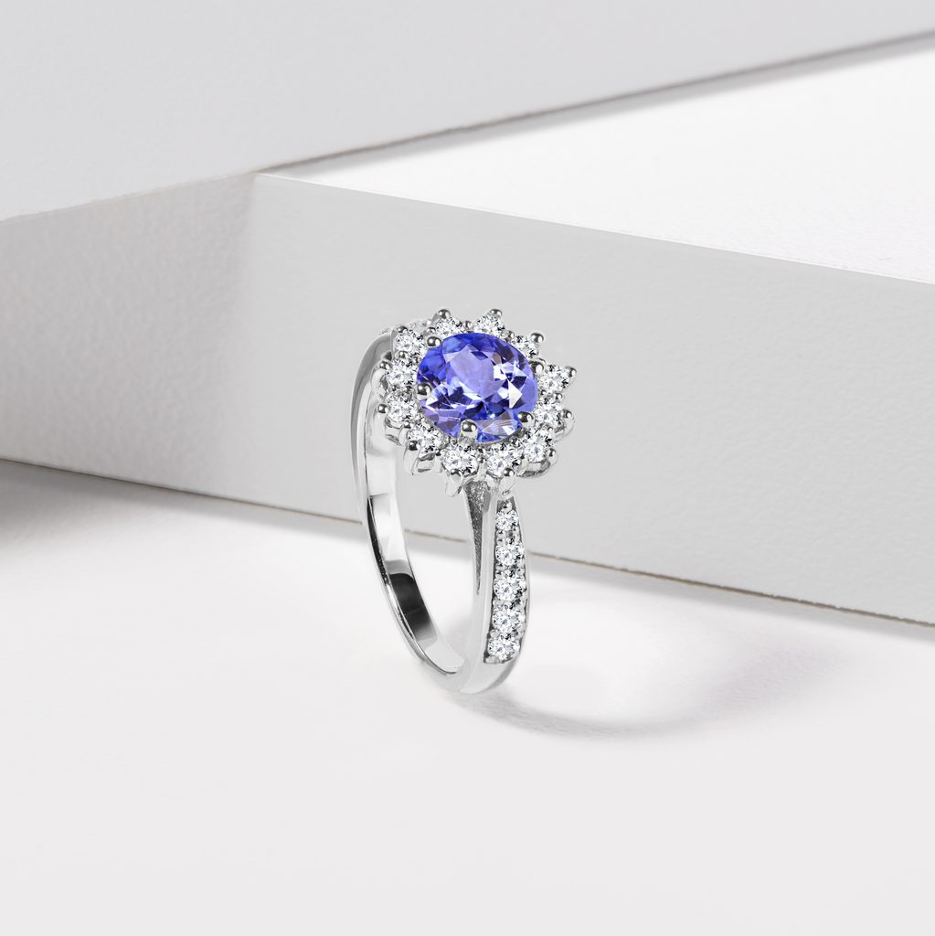 A 14k white gold ring decorated with a central intensly blue-violet tanzanite that's encircled by bainty clear round diamonds. The diamonds also continue in a channel setting along the sides of the ring and give the jewelry an unmistakable, dazzling sparkle. Ladies who like distinctive stones in clean, elegant designs will especially love this ring.