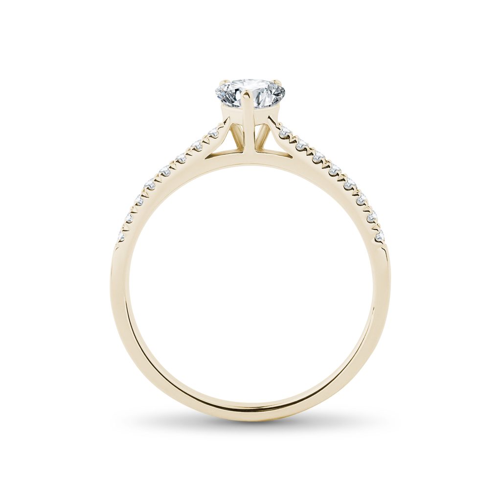 A 14k yellow gold ring decorated with a heart diamond weighing 0.3 carats which is complemented by channel settings of dainty round diamonds on both sides. The ring looks feminine and romantic yet also very elegant and the beautiful, natural sparkle of the diamonds really make it stand out on the hand. It's an ideal romantic present from the heart and would also make a wonderful engagement ring that would be a pleasure to wear every day.