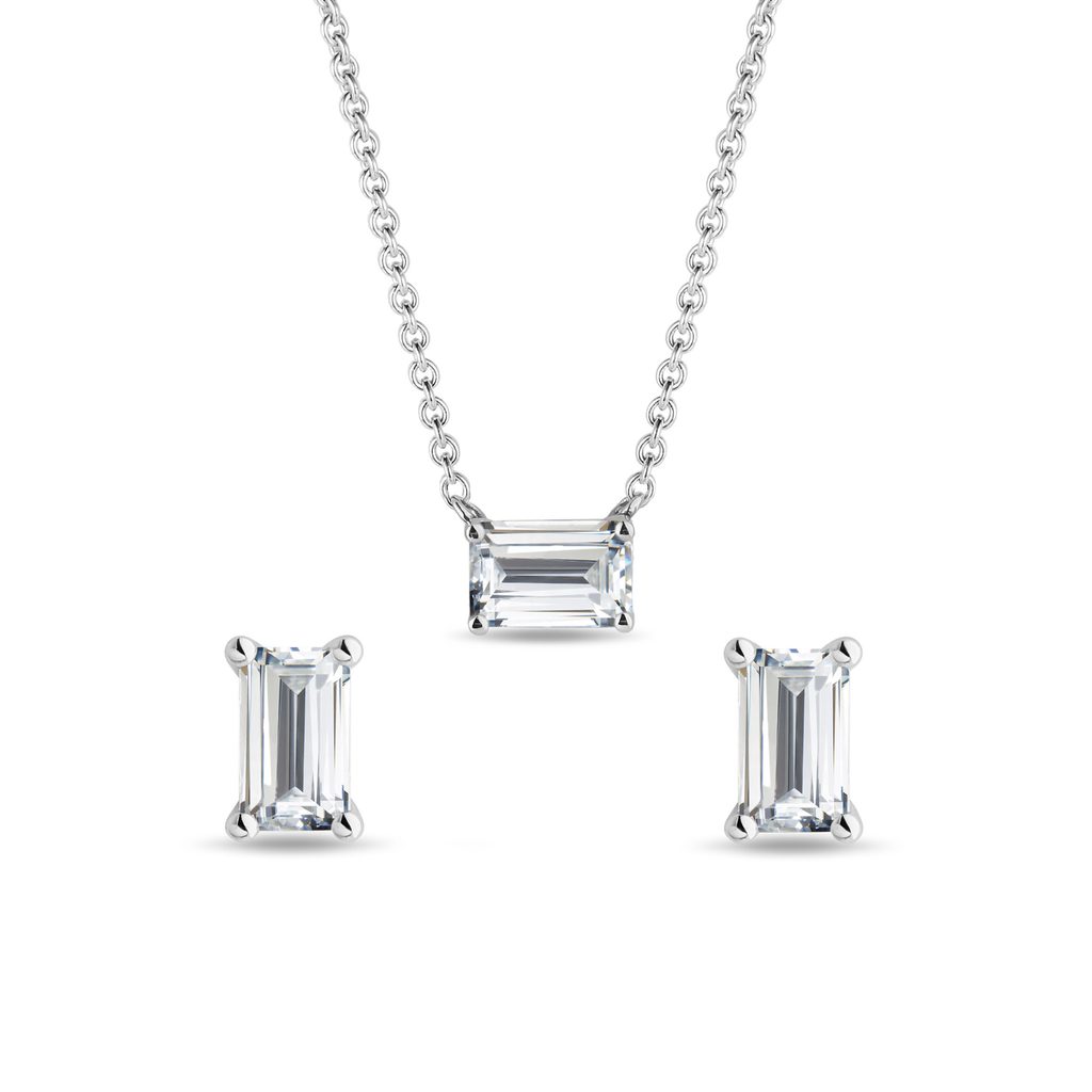 Minimalist jewellery set made of white 14k gold impresses with laboratory diamonds in emerald cut. The rectangular cut of the stones gives the jewellery a sleek and modern look, and is also easy to combine with other jewellery. The necklace has a length of 40 cm and the earrings have a comfortable button fastening.