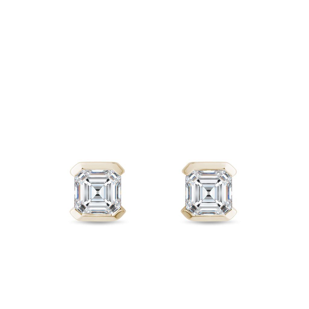 A timeless pair of 14k yellow gold stud earrings decorated with asscher diamonds weighing a total of 0.80 ct.This unique diamond cut creates a fascinating optical effect that brings out the clarity and brilliance of the stones. The diamonds stand out beautifully on their own, adding a wonderful elegance to the jewelry. The overall design looks luxurious while retaining an understated, minimal character.