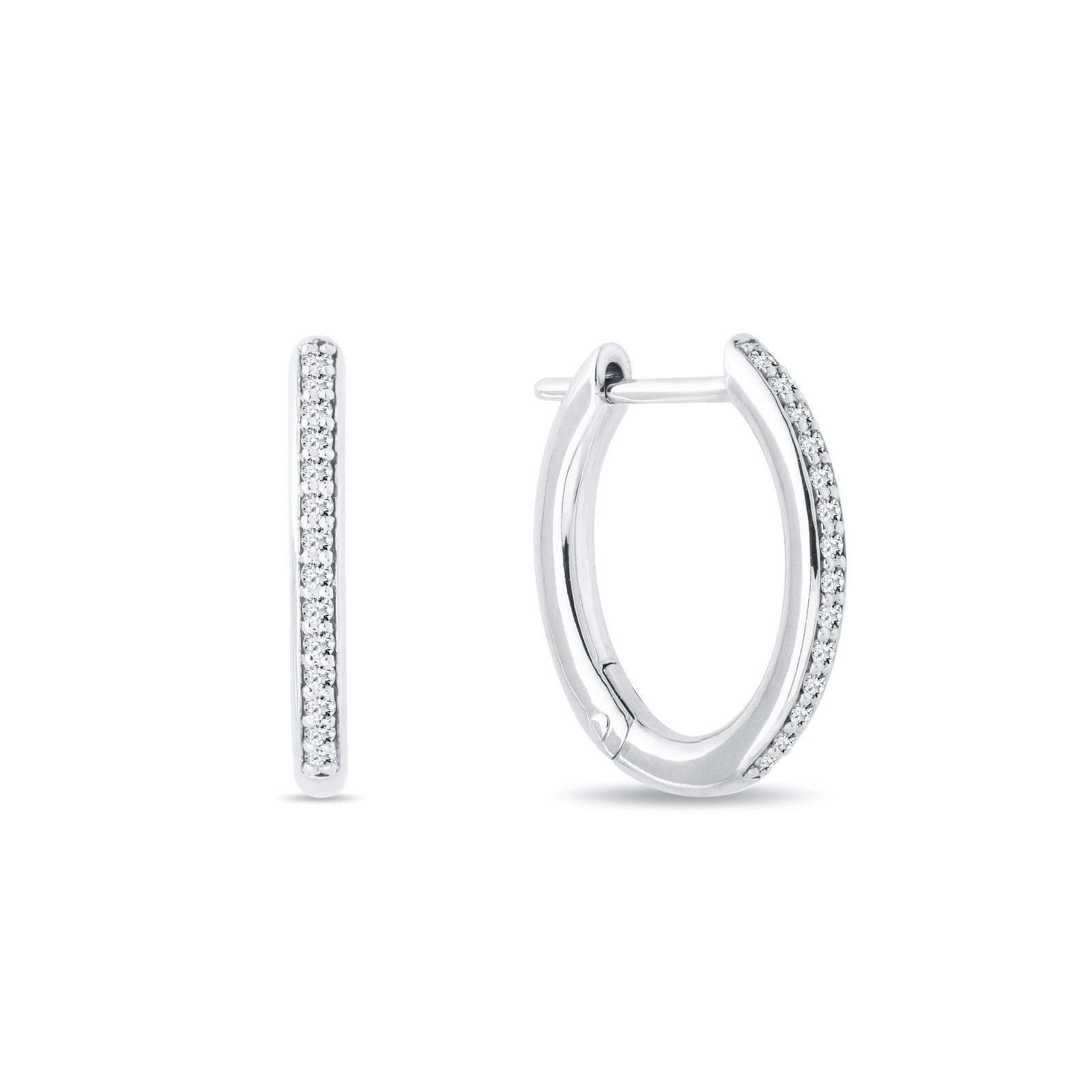 An elegant pair of small 14k white gold hoops that are decorated with dainty diamonds in a brilliant cut which give the earrings an unmistakable sparkle and timeless elegance. The discreet closure is practical and comfortable while the slightly oval shape with a 14 mm diameter gives the earrings a unique, stylish look. A genuinely elegant piece of jewelry that's ideal both for everyday wear and special occasions.