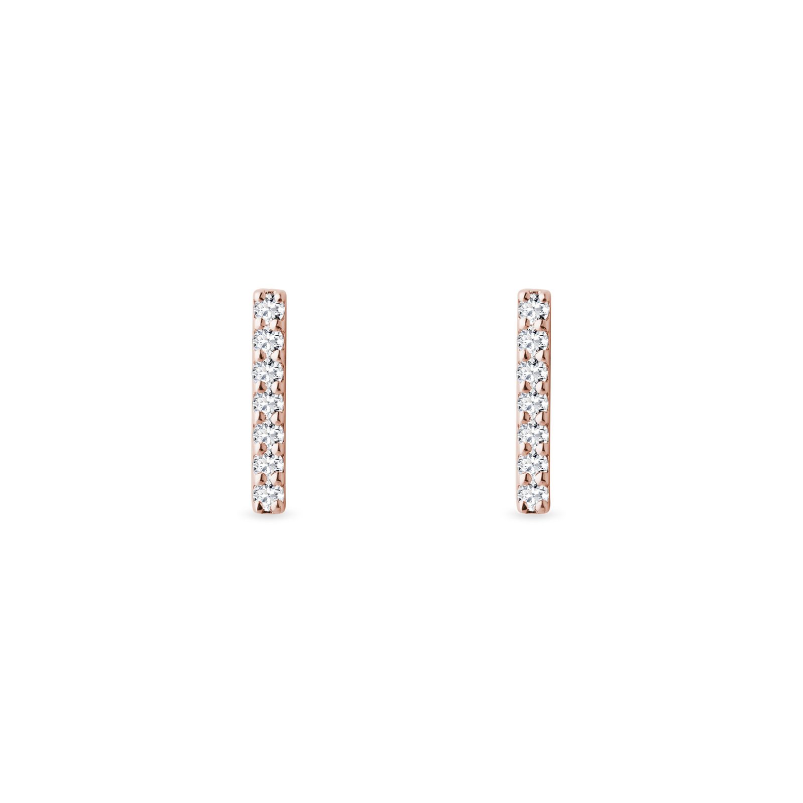 A pair of minimalist 14K rose gold stud earrings with 1 cm long straight bars, each decorated with seven sparkling diamonds. The timeless design and practical push back closure makes these earrings an ideal accessory for everyday wear. Perfect for stacking with more earrings or pairing with other jewelry.