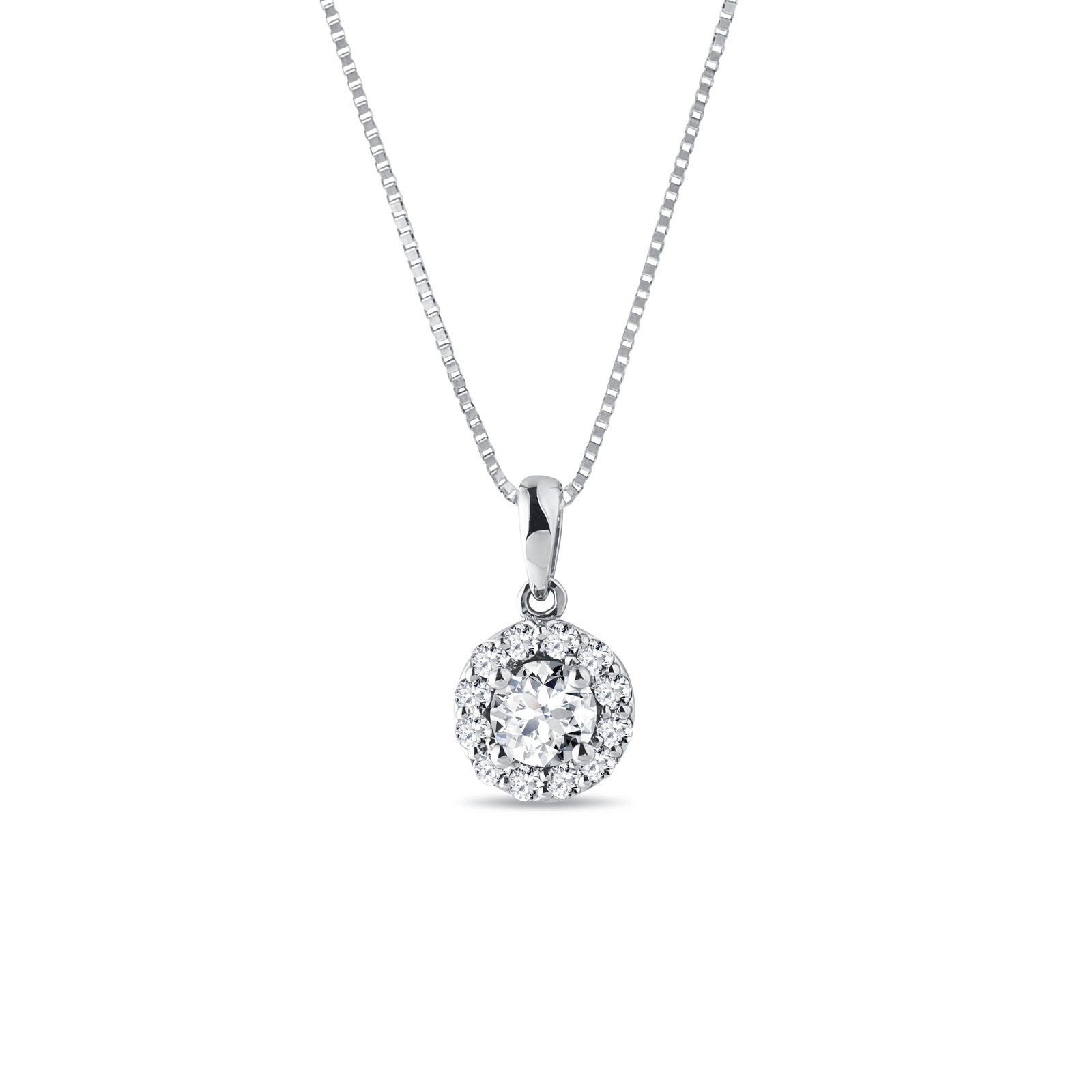 Luxury necklace made of 14k white gold and decorated with diamonds in a classic halo design. The central, round diamond is surrounded by smaller diamonds and together, form an accessory that is vibrant and eye-catching. An extraordinary gift idea- every woman would be happy to receive this necklace.