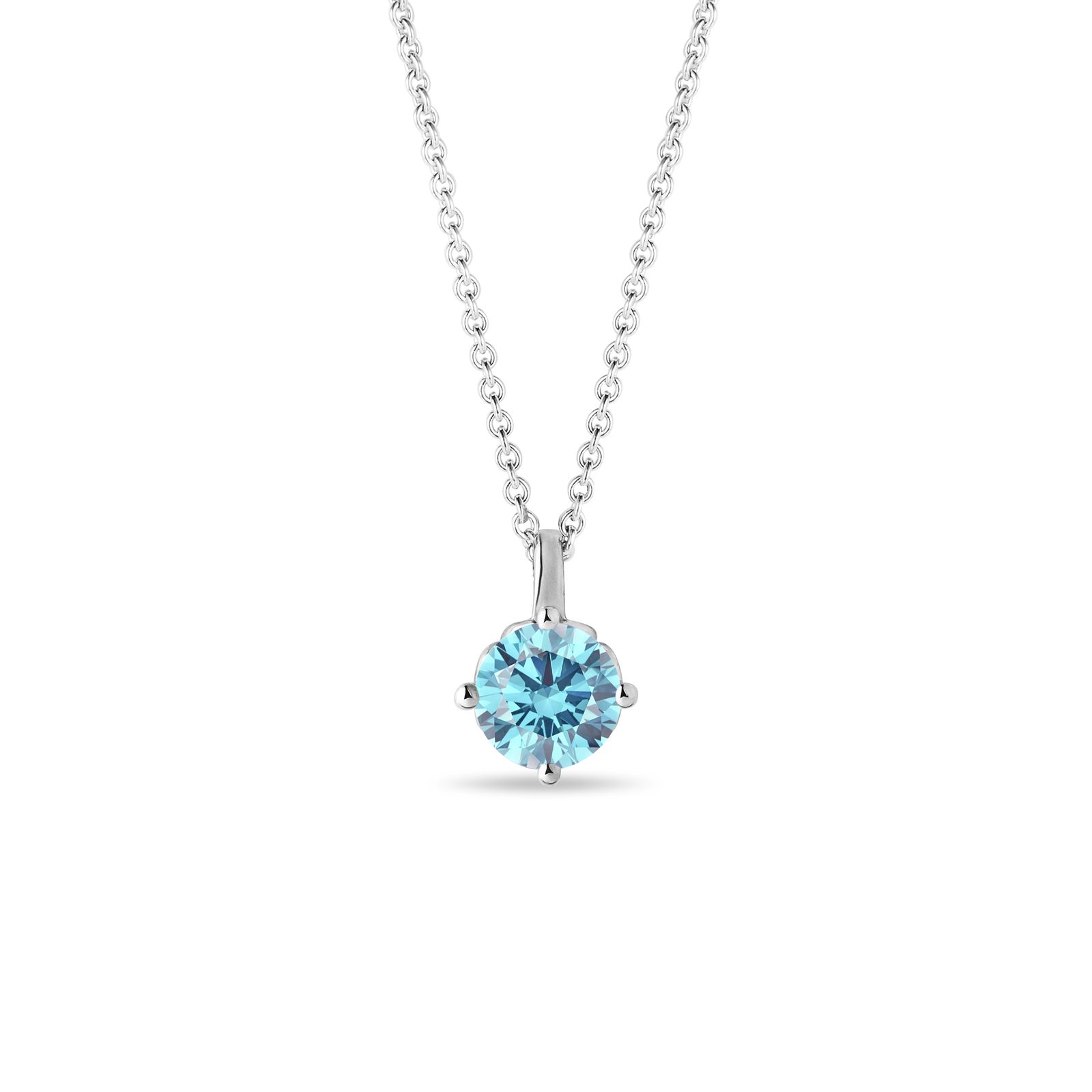 This necklace consists of a white gold rolo chain and a lovely removable pendant showcasing a round half carat lab grown blue diamond. The stone stands out for its clarity and soft sparkle that beautifully catches the light as it moves. This necklace would make an excellent understated accessory suitable for everyday wear as well as stand out push present.