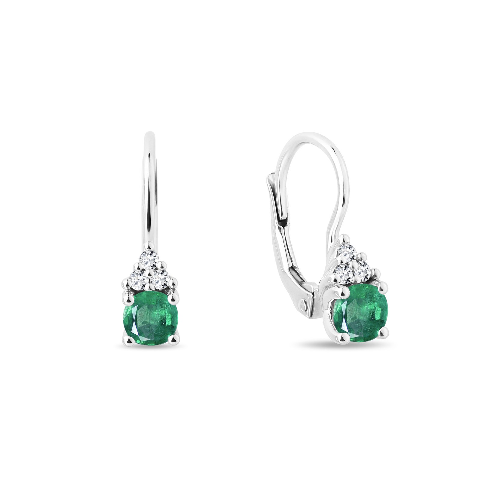 These 14k white gold drop earrings are decorated with round emeralds weighing a total of 0.5 ct. Their lovely green color is further enhanced by three small diamonds that add a soft sparkle and emphasize the natural character of the stones. The elegant design is complemented by a convenient leverback clasp that allows for comfortable wear.
