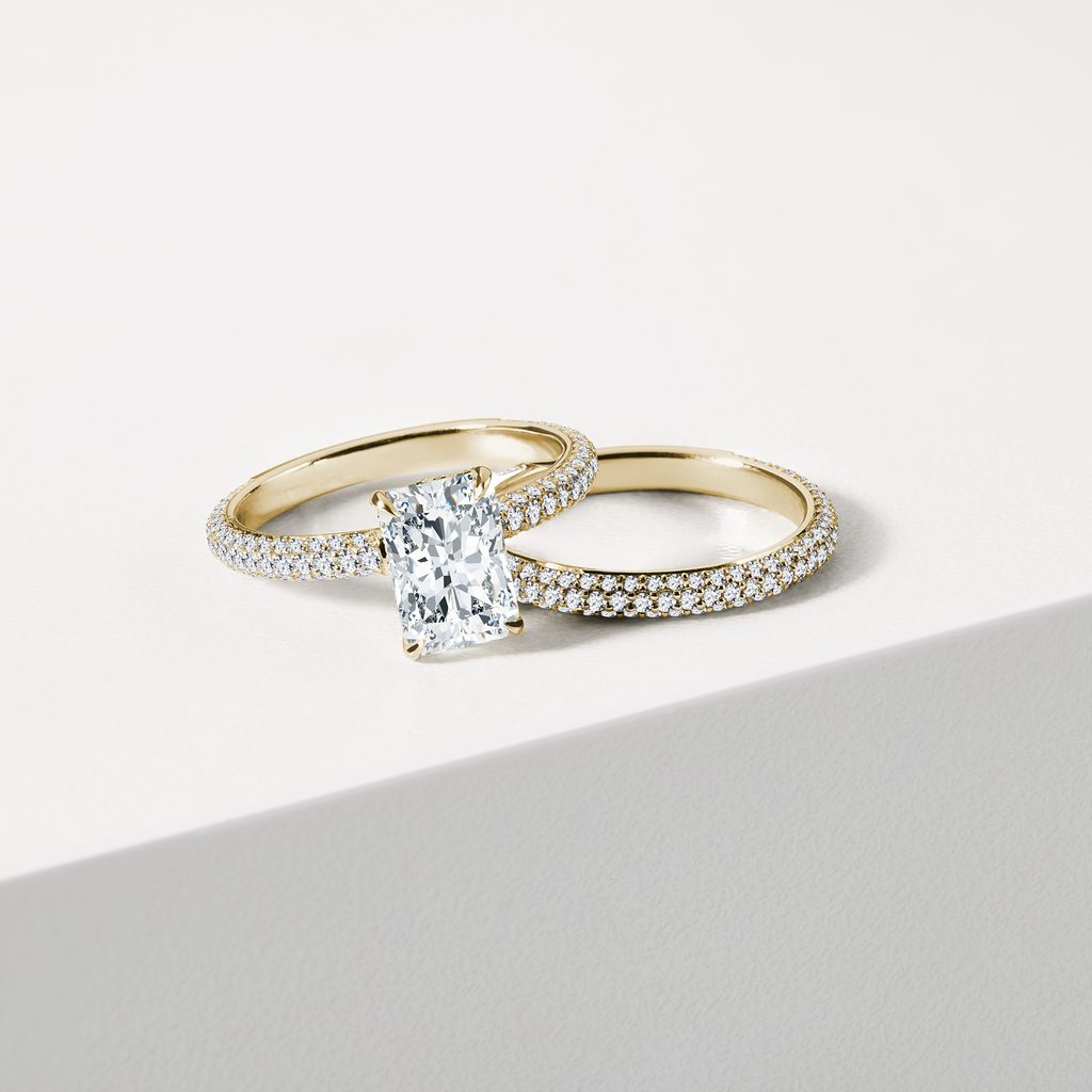 This 14k yellow gold bridal set features an engagement ring with a striking 1.6 carat lab grown radiant-cut diamond along with a dainty wedding band channel set all the way around with small clear diamonds. These give the band a dazzling luster and sparkle. Combined, this set looks very sophisticated, emphasizing a sense of detail and luxury.