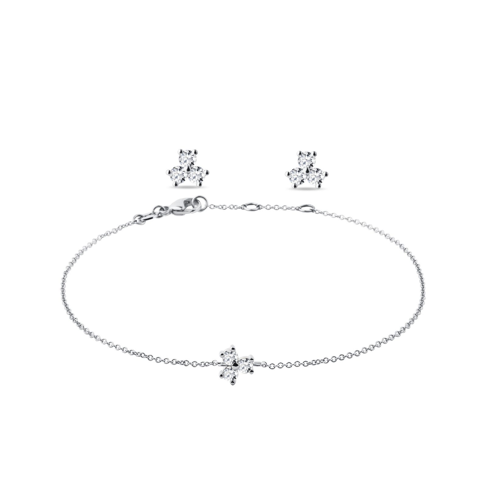 A minimalist earrings and bracelet set with diamonds in 14K white gold which comes in a design reminiscent of a shamrock. This design is perfect for ladies who love fine and pristine beauty which is further enhanced by sparkling diamonds. The earrings have a pushback style closure.