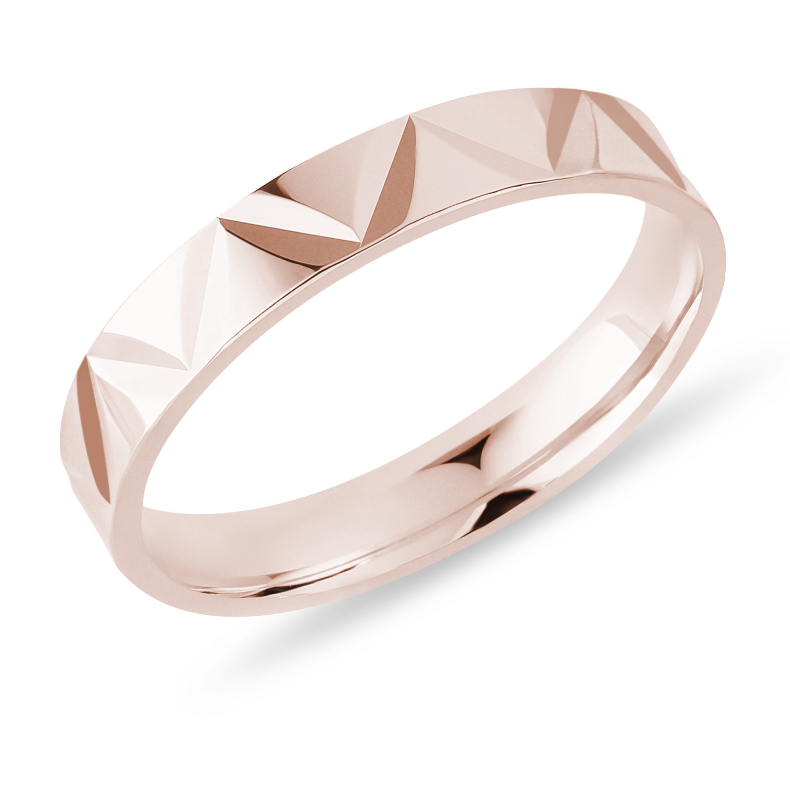 This modern 14k rose gold men's wedding band is 4 mm wide and features an engraved surface with a zig zag pattern which reflects light beautifully. This ring pairs a classic band with an interesting detail while keeping a clean and simple look overall. It would suit men who like comfort and original style.