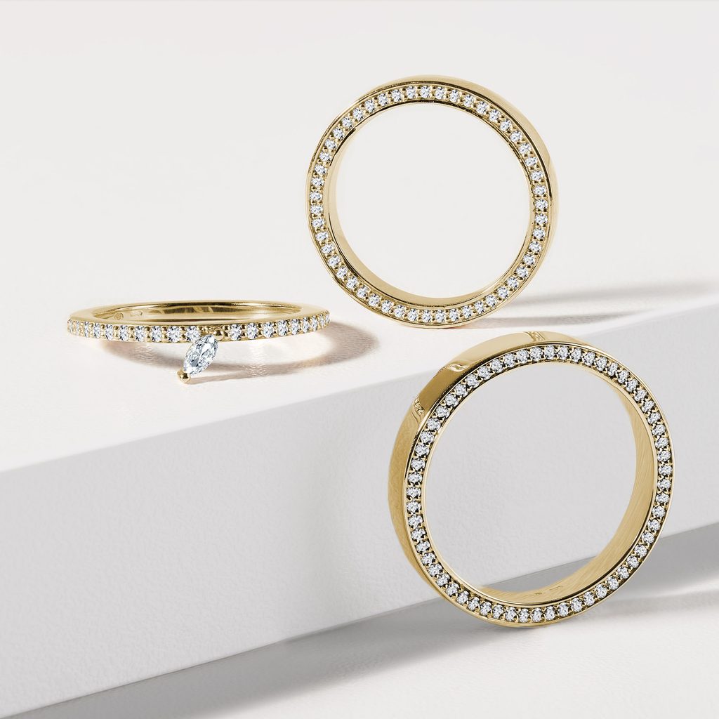 This 14k yellow gold wedding ring attracts attention for its refreshingly modern design. The shiny band is decorated on the side by a row of small round white diamonds that add a soft luxurious accent to the ring. The result is a ring that feels elegant and modern at the same time. Perfect for men who value detail, style and unique design.
