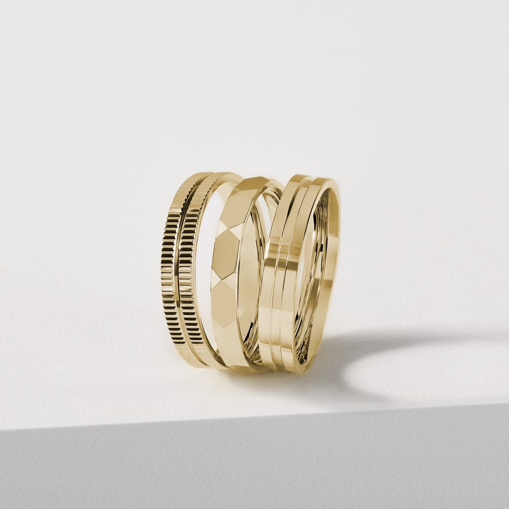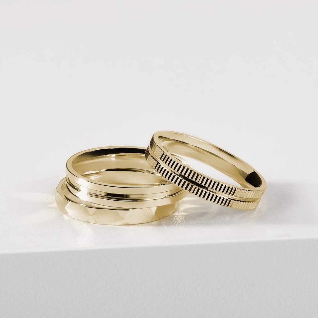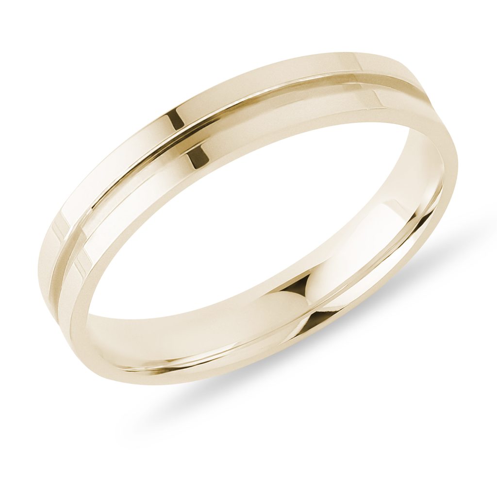 A 14k yellow gold men's wedding ring that features a high gloss finish and a carved center groove that gives the otherwise smooth surface a stylish and elegant look. The perfect choice for men who are after an inconspicuous ring with an original detail.