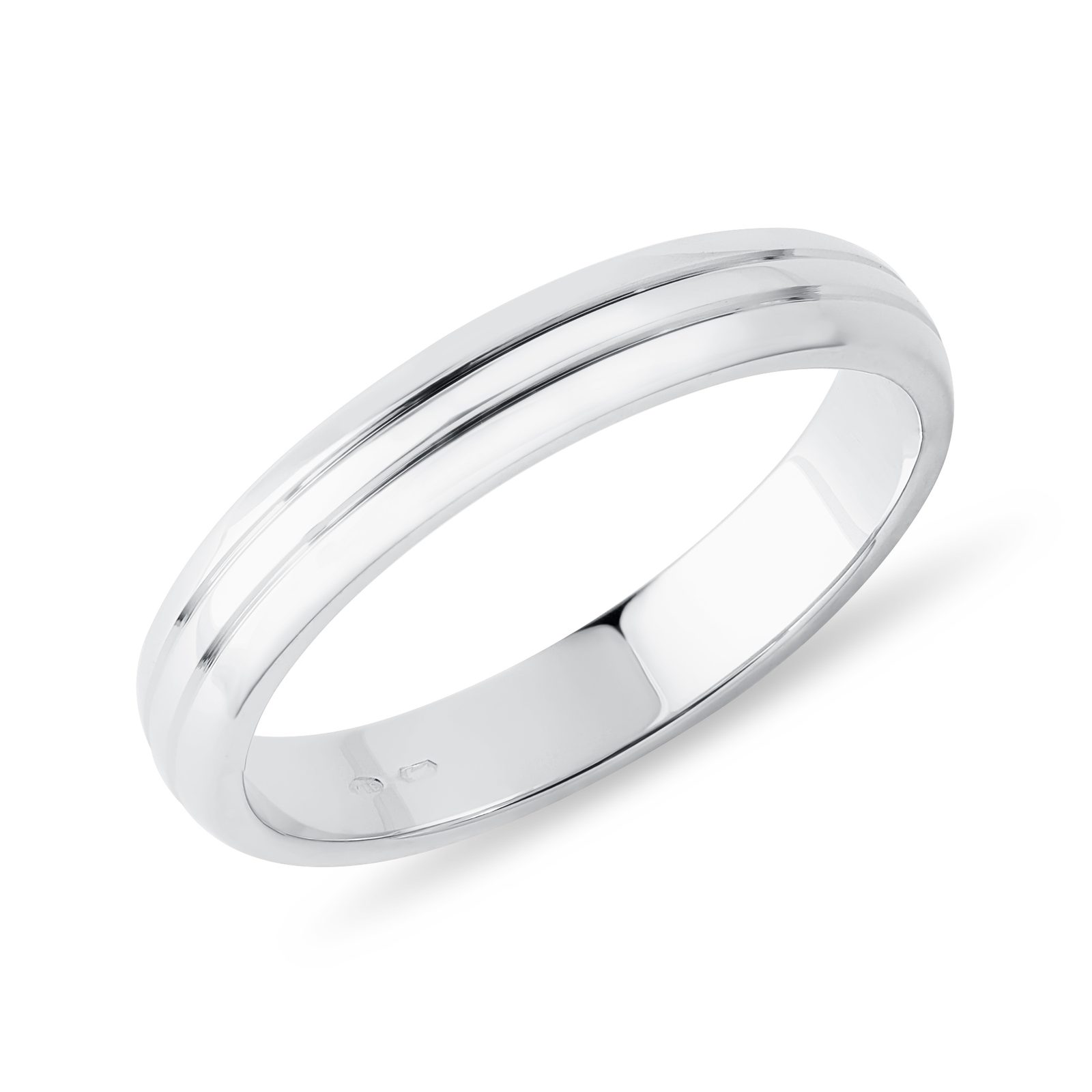 Men's wedding ring made of 14k white gold is decorated with two finely engraved lines around the band. The polished finish and rounded edges of the ring make this one of our most popular wedding models!