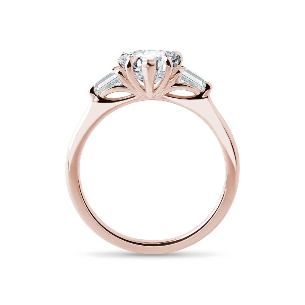 This 14k rose gold ring immediately attracts attention for its striking 1 carat lab grown heart diamond. The central stone is further complemented by pear diamonds on each side that help to accentuate its clarity, color and sparkle. As an engagement ring, it would especially appeal to ladies who like jewelry with a simple design and luxurious look.