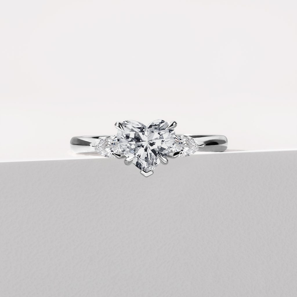 This 14k white gold ring immediately attracts attention for its striking 1 carat lab grown heart diamond. The central stone is further complemented by pear diamonds on each side that help to accentuate its clarity, color and sparkle. As an engagement ring, it would especially appeal to ladies who like jewelry with a simple design and luxurious look.