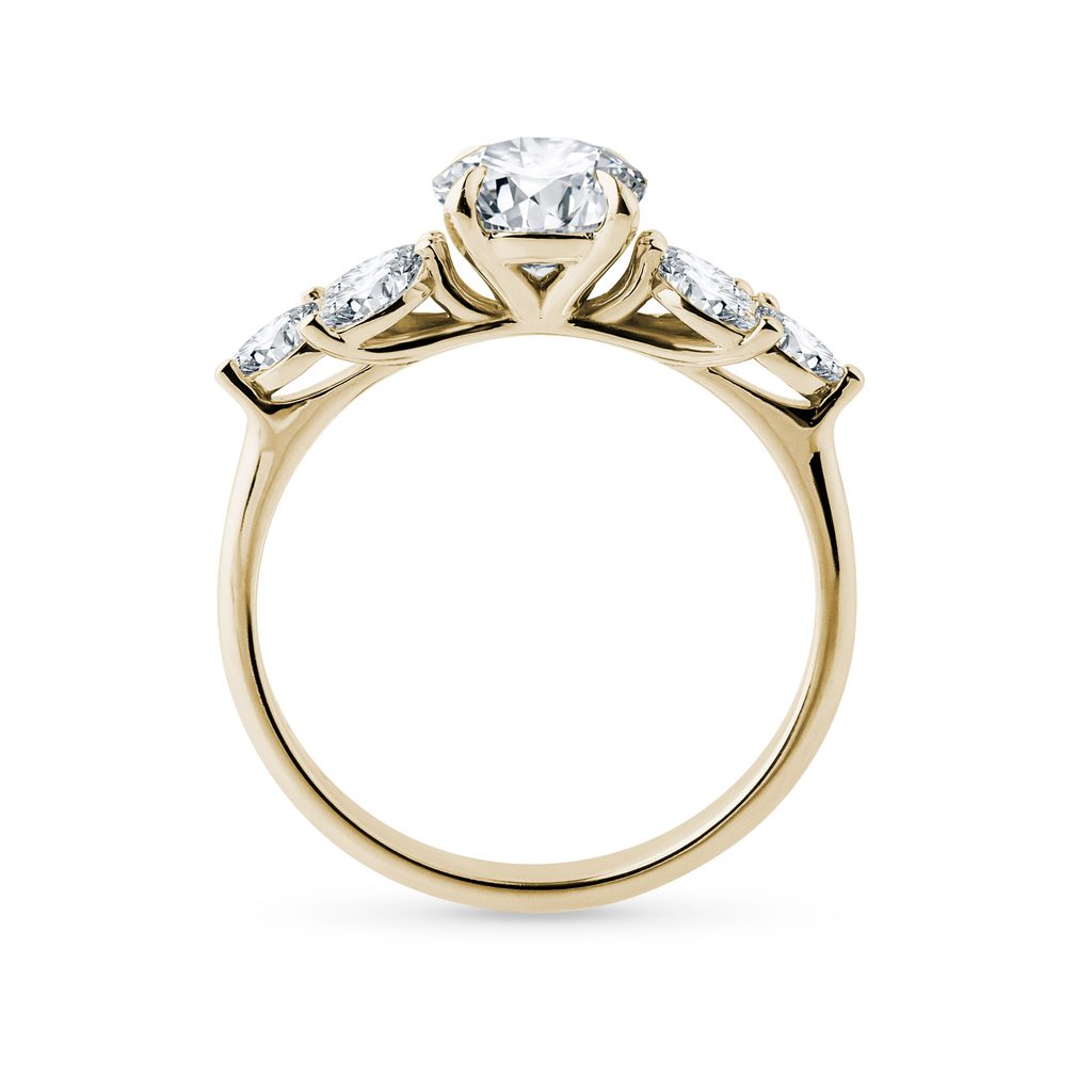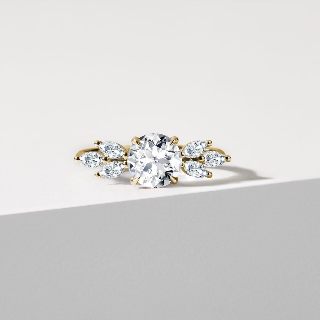 This 14k yellow gold ring features a gorgeous 1 carat lab grown round diamond in the center. It is complemented on the sides by marquise diamonds that add an interesting, slightly romantic detail to the ring. The design is inspired by natural themes and has a very feminine feel to it, making this ring an excellent choice for an engagement ring or a gift for a variety of occasions.
