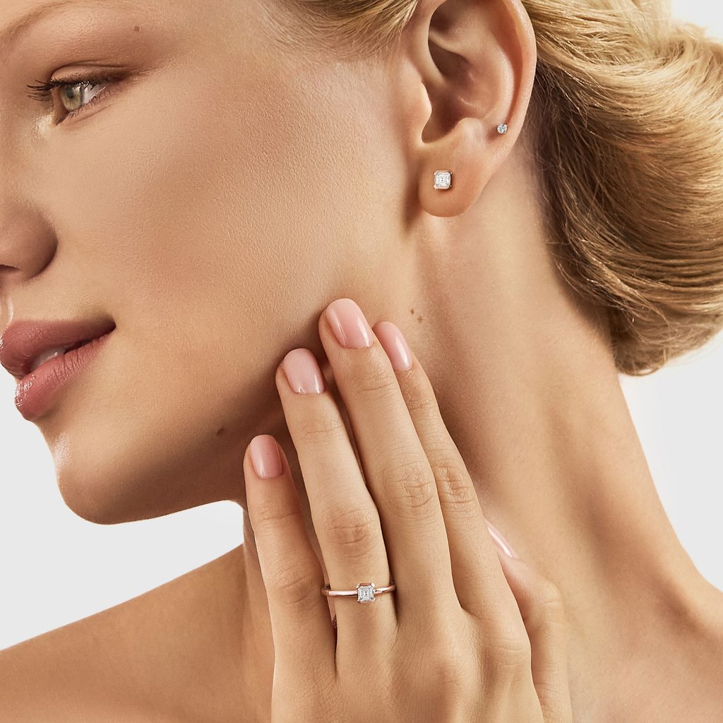 A stunning 14k rose gold engagement ring that's decorated with a central diamond weighing 0.4 ct in the very unique asscher cut. This square cut is specifically known for its optical effect which resembles a hall of mirrors. An extraordinary gemstone cut made famous in the Art Deco era, this ring would make for a very original engagement ring.