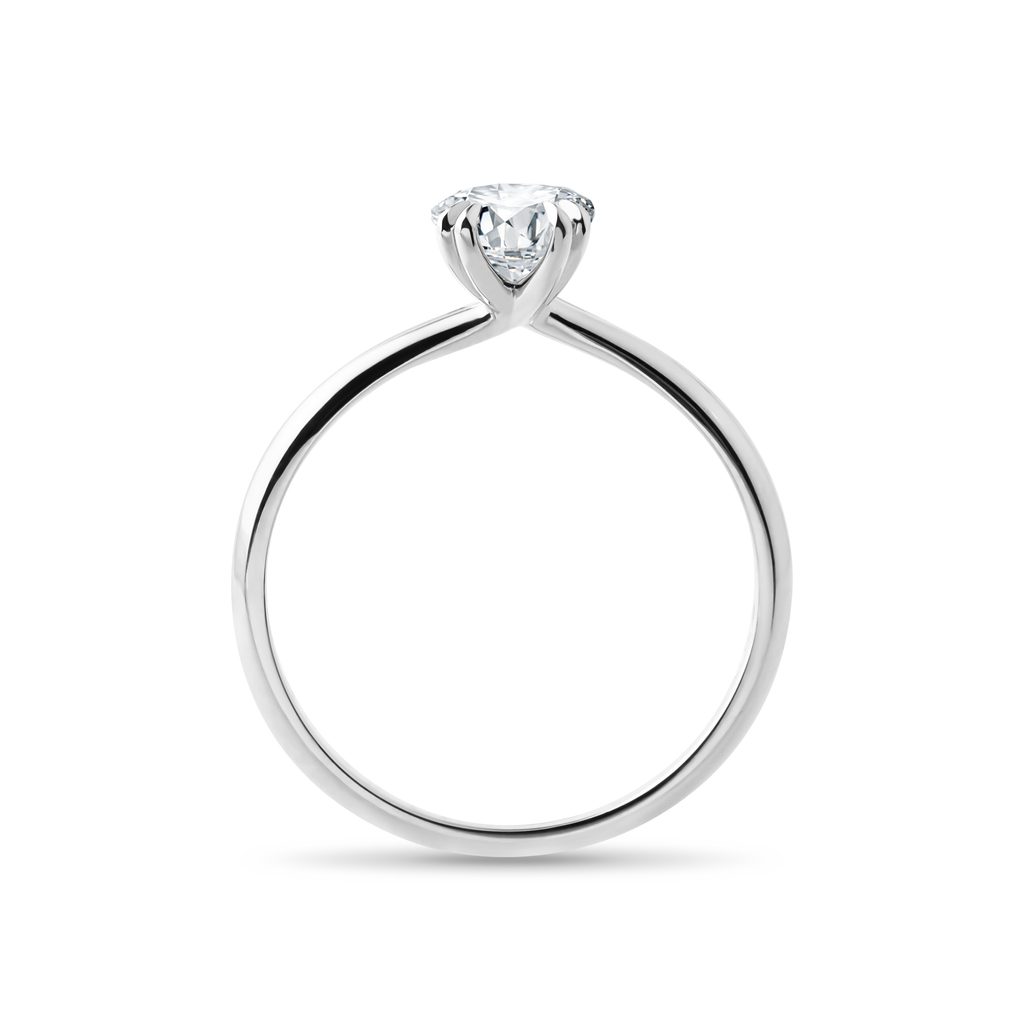 An elegant white gold ring with an impressive 1 carat oval lab grown diamond in a double prong setting which secures the stone firmly in place and allows it to catch the light beautifully from all angles. This gives the ring a dazzling sparkle that immediately catches attention. Ideal as an engagement ring or as a very special anniversary present.