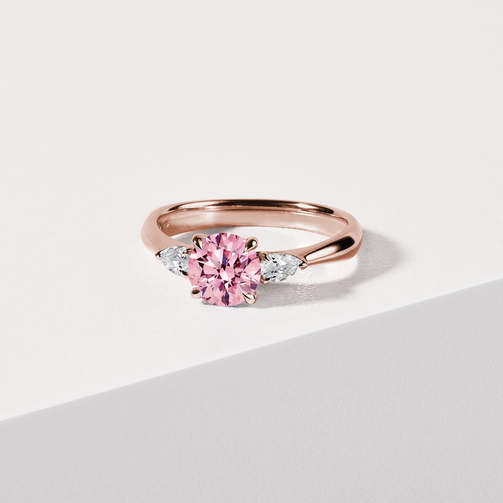 A 14k rose gold ring that catches the eye at first glance with its striking 1 carat pink lab grown round diamond. It is complemented on each side by pear diamonds which accentuate its clarity, color and sparkle even more. The design of this lovely ring was inspired by timeless classics with a modern twist, making it perfect for a variety of occasions, including as a unique engagement ring or an anniversary present.