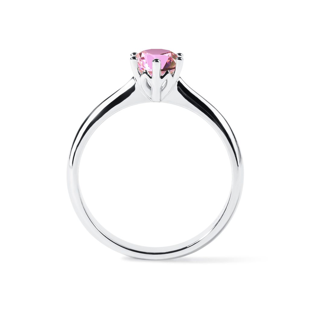 This 14k white gold ring comes in a popular design featuring a half carat pink lab grown diamond. The round stone in a brilliant cut has been set into four prongs that allow it to wonderfully highlight its radiant beauty while the tapered shank of the band gives the ring a very refined and elegant look. As an engagement ring, it would especially suit ladies who love classic rings in with a soft color accent.