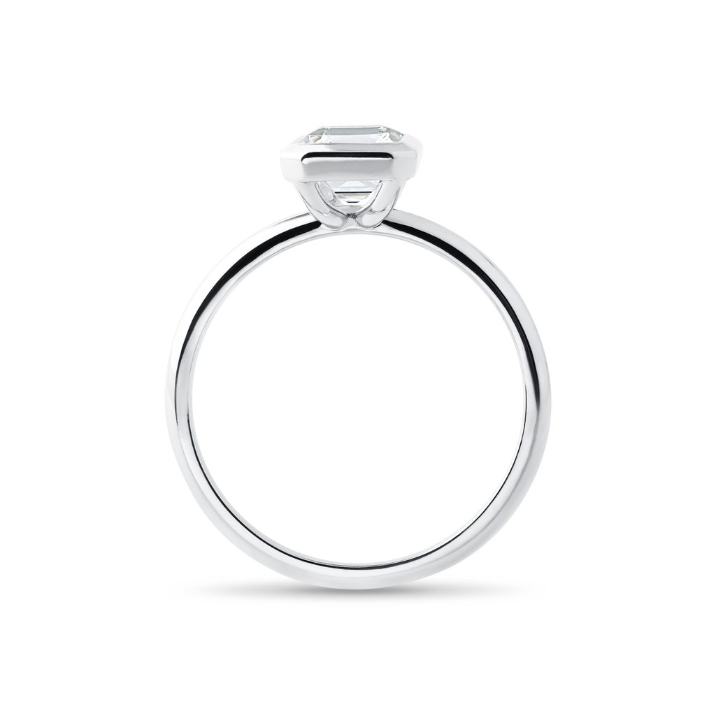 A beautiful 14k white gold ring that showcases a striking 1.4 ct lab grown diamond in a rectangle radiant cut. The stone is set into a smooth bezel that highlights its exceptional clarity and allows its luster and sparkle to shine to their fullest. A perfect ring for an engagement or other important moments in life.