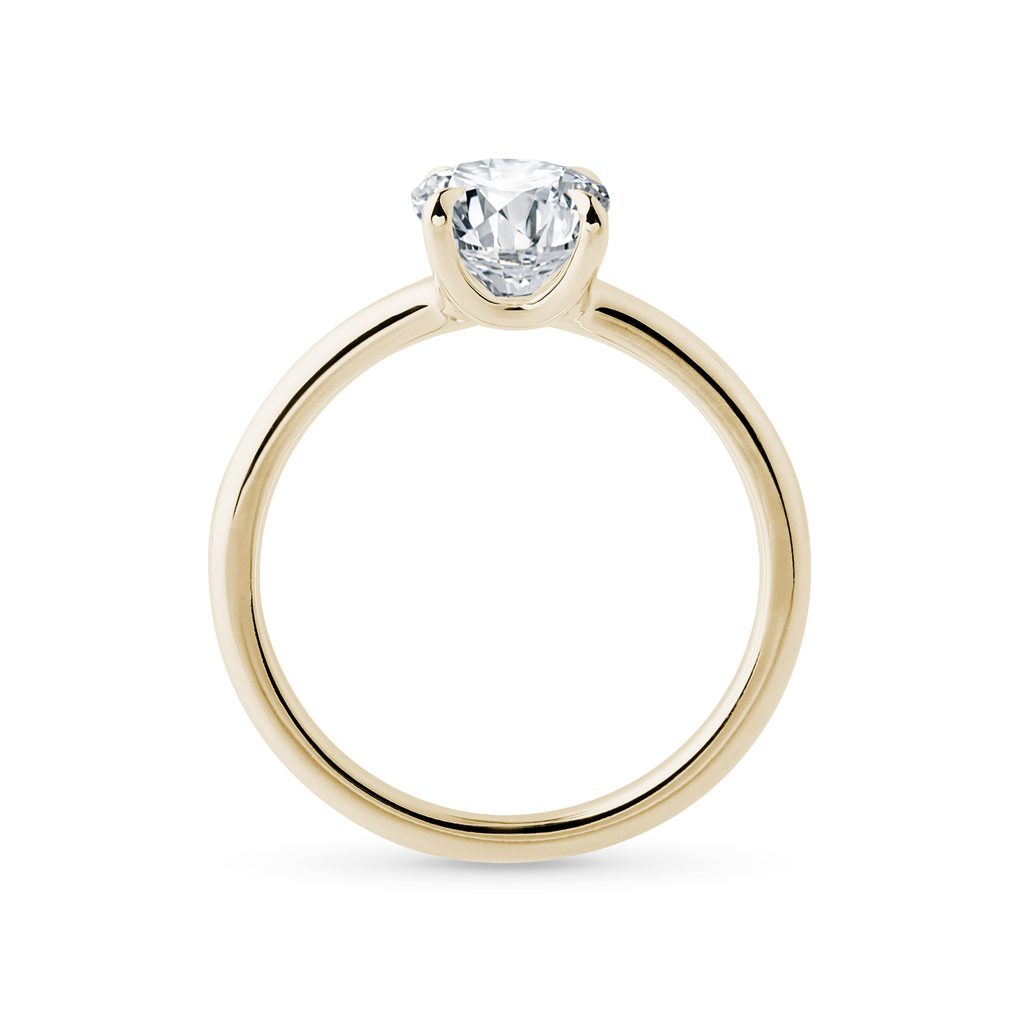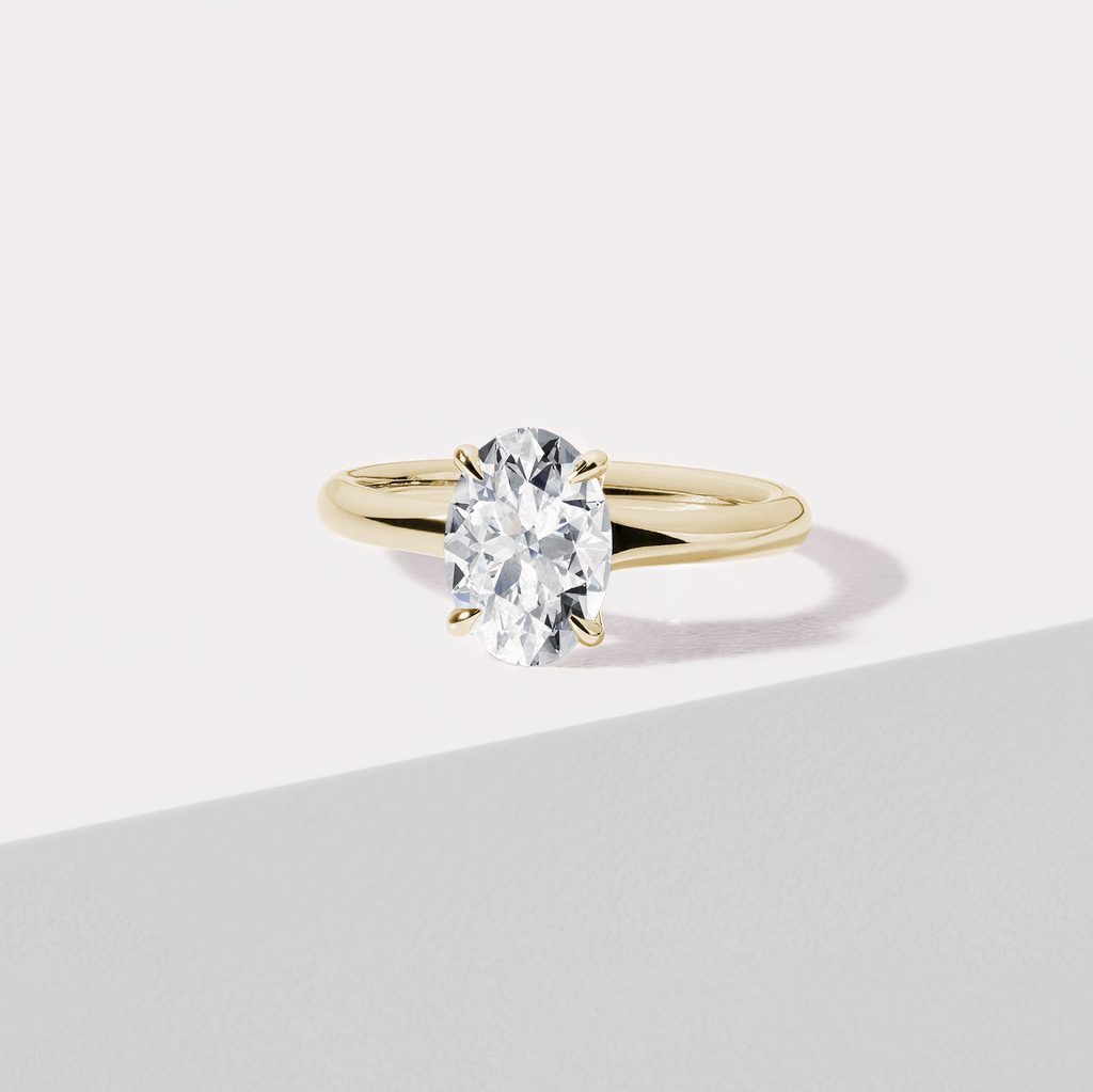 This 14k yellow gold solitaire ring features a showstopping 1.5 ct oval lab grown diamond. The stone is set into four prongs that showcase its quality and sparkle to its fullest. The clean and elegant design of this ring makes it a striking, timeless piece of jewelry and a very original choice for an engagement ring.