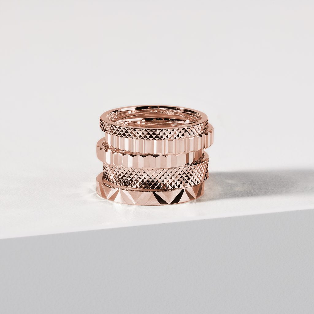 This 14k rose gold 4 mm women's ring is decorated with a textured pattern that accentuates the clean design and quality of the workmanship. The ring has a slightly rounded profile that has been designed to fit well on the finger so that it is comfortable for everyday wear. This ring will layer easily with others and will appeal to women who like classic designs with understated original details.