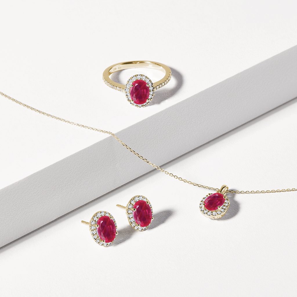 This necklace consists of a 14k yellow gold chain and removable ruby pendant in an oval halo design. The clear diamonds encircling the central stone give the jewelry a luxe, sophisticated feel. This elegant and timeless piece of jewelry will delight women with a weakness for natural color gemstones.