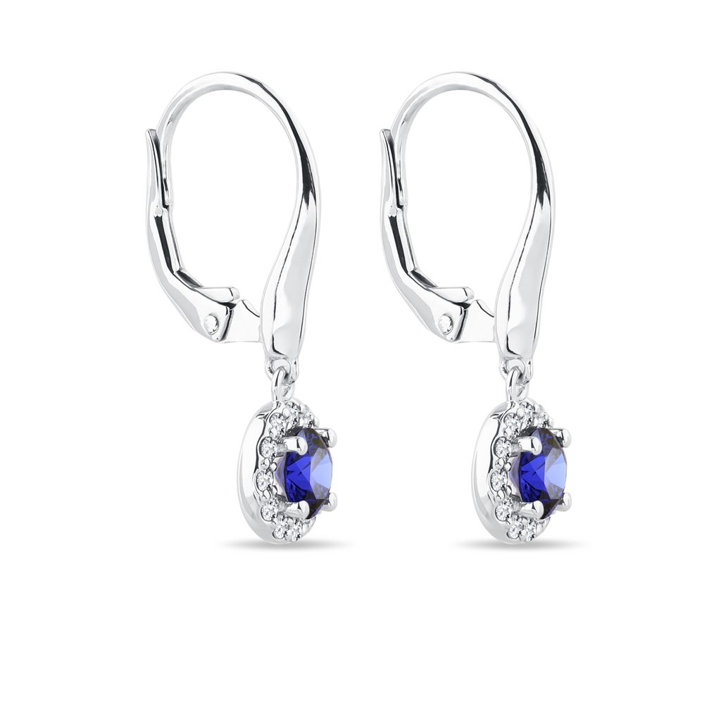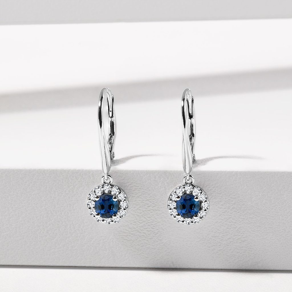 A pair of elegant 14K white gold drop earrings decorated with blue sapphires and colorless diamonds. These earrings with a leverback closure are the perfect luxury accessory for any occasion. The distinct color of the sapphires also shines in white gold. Take a look at the other jewelry from this design range.