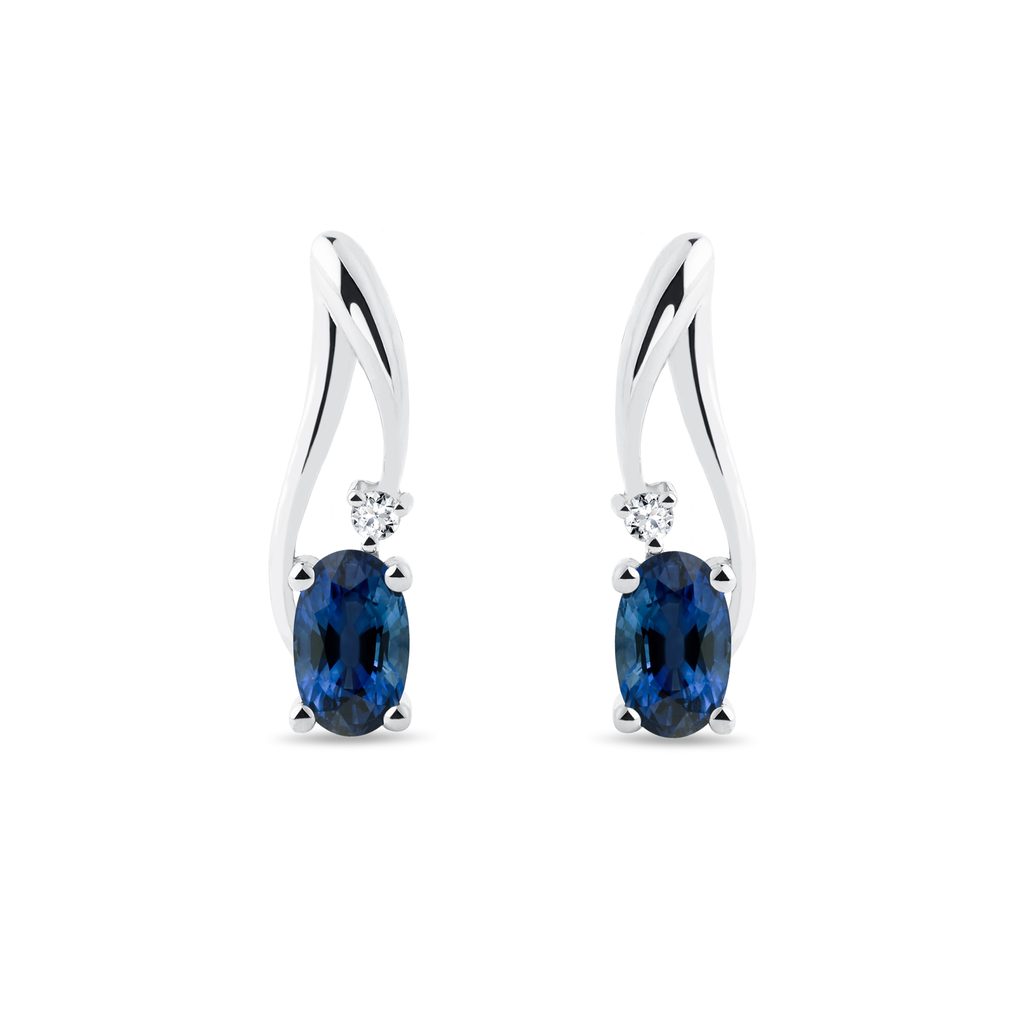 Earrings made of 14k white gold and decorated with diamonds and blue sapphires in an oval cut. A beautiful accessory for both festive events and casual wear. The comfortable, patented latch back clasp makes these earrings suitable for any occasion.
