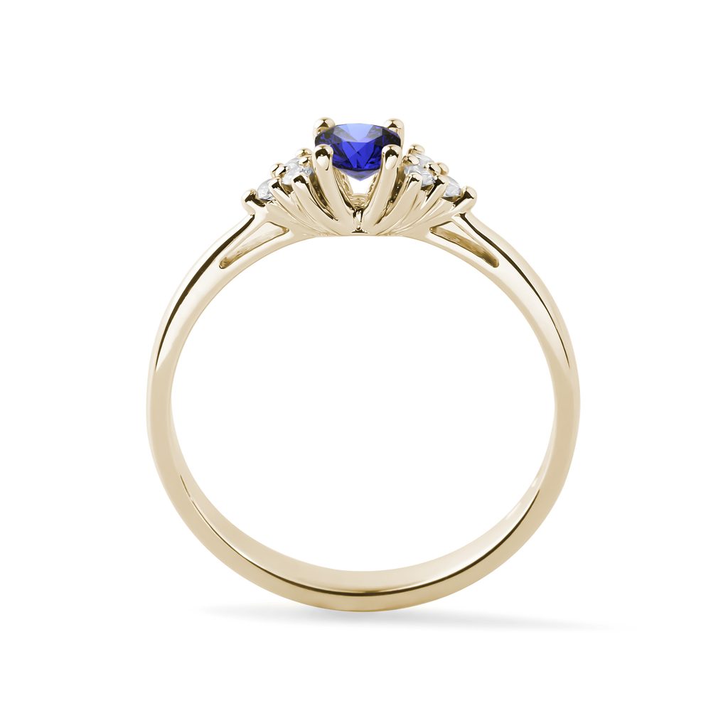 This 14k yellow gold ring is decorated with a round, deep blue sapphire. It is complemented by a total of six small diamonds on the sides that add sparkle to the ring and allow the sapphire to stand out beautifully. The ring has a very dainty and elegant look to it overall.