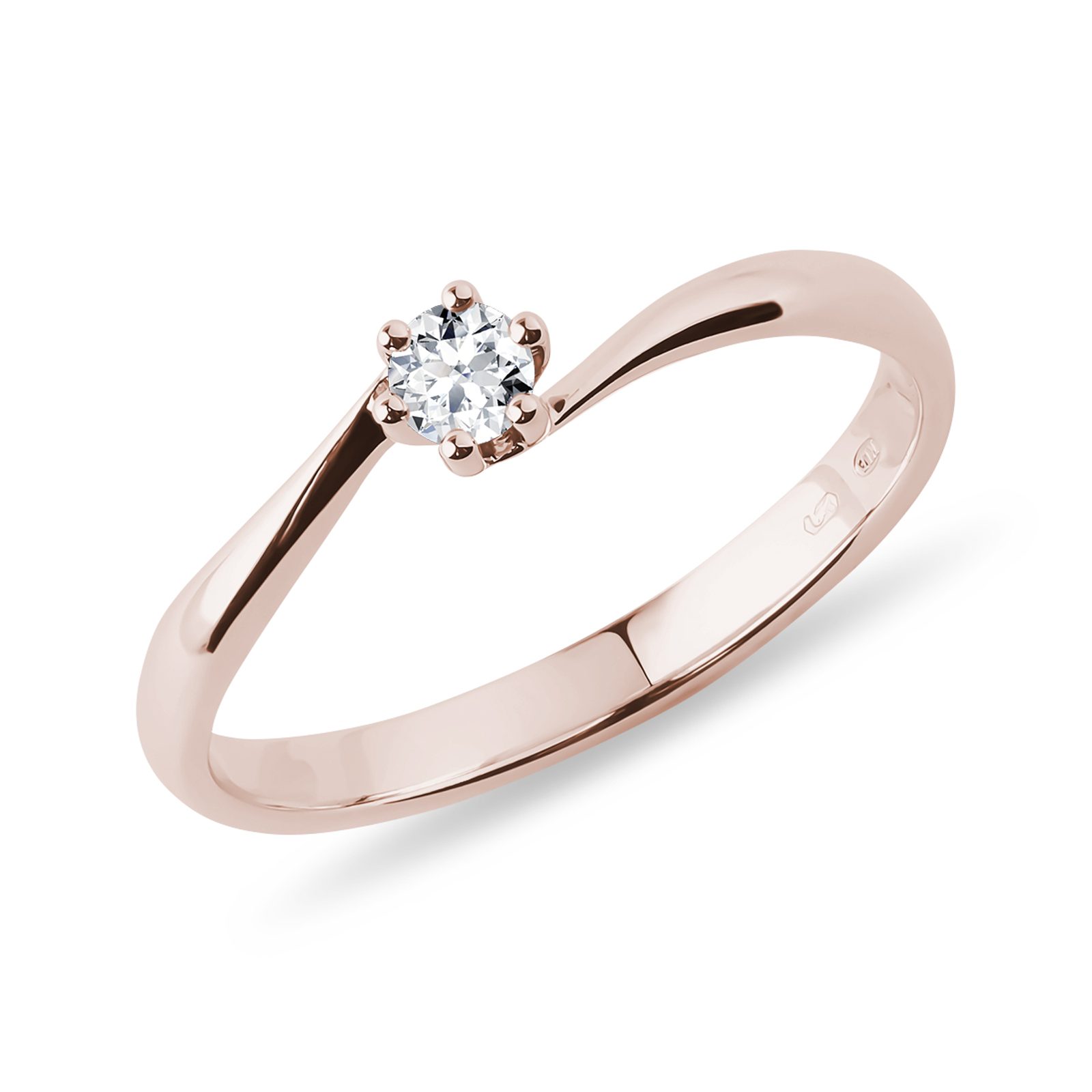 Engagement ring with a central diamond in a round cut and crafted in 14k rose gold. The untraditional band design is a stunning look that will always impress. A creative style to an otherwise simple engagement the ring is perfect for admirers of classic, beautiful jewelry.