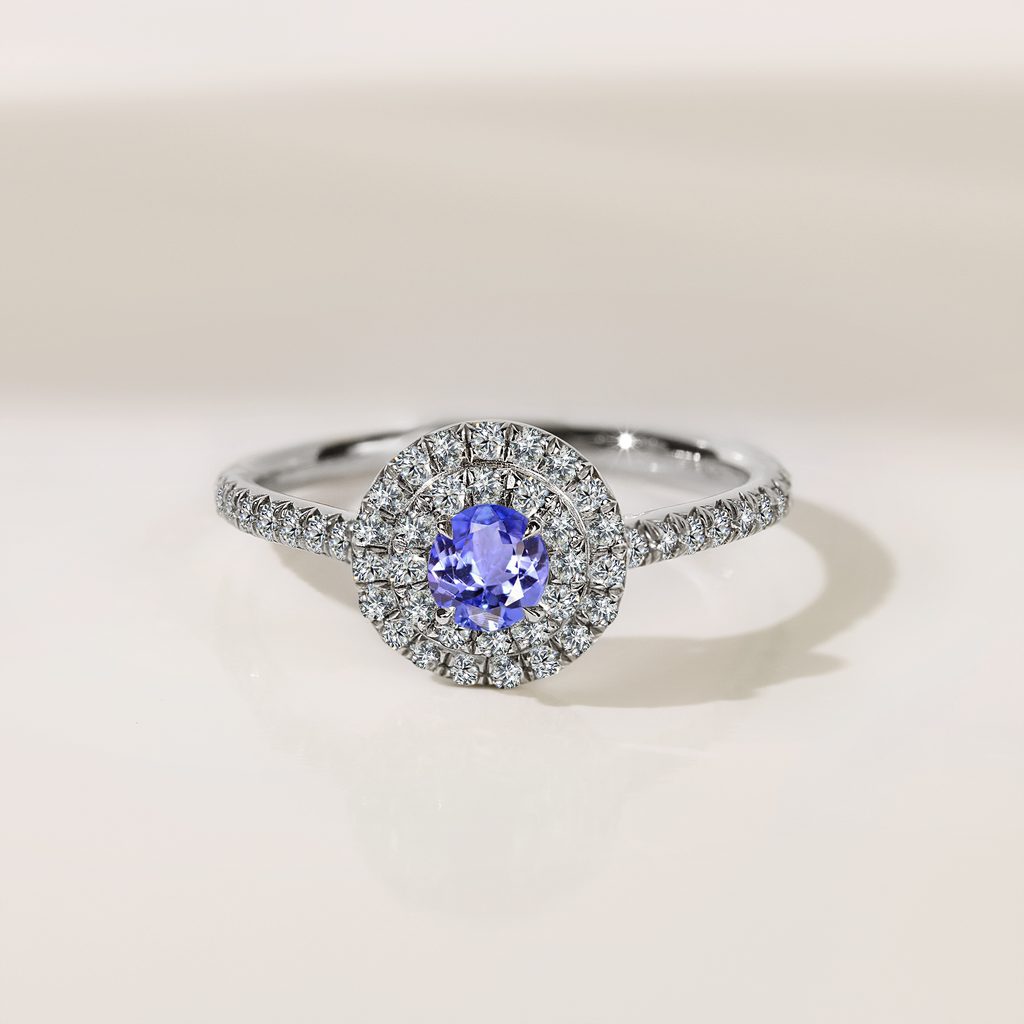 A luxurious 14k white gold ring with a round tanzanite in an impressive double halo design that helps to visually enlarge the look of the central stone. The tanzanite is encircled by two rows of diamonds that continue in a channel setting around the band of the ring. The result is an absolutely dazzling piece of jewelry that’s perfect as an exceptional present for an anniversary or any other special occasion.