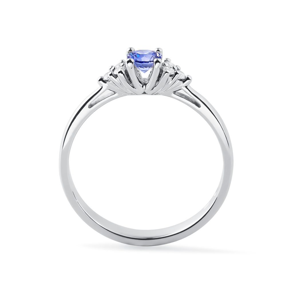 A very romantic 14k white gold ring decorated with a unique tanzanite and a total of six small, clear, round diamonds. This piece of jewelry is the ideal gift for women who love gemstones in understated colors and who are looking for something original and elegant that will stand out beautifully on any occasion.