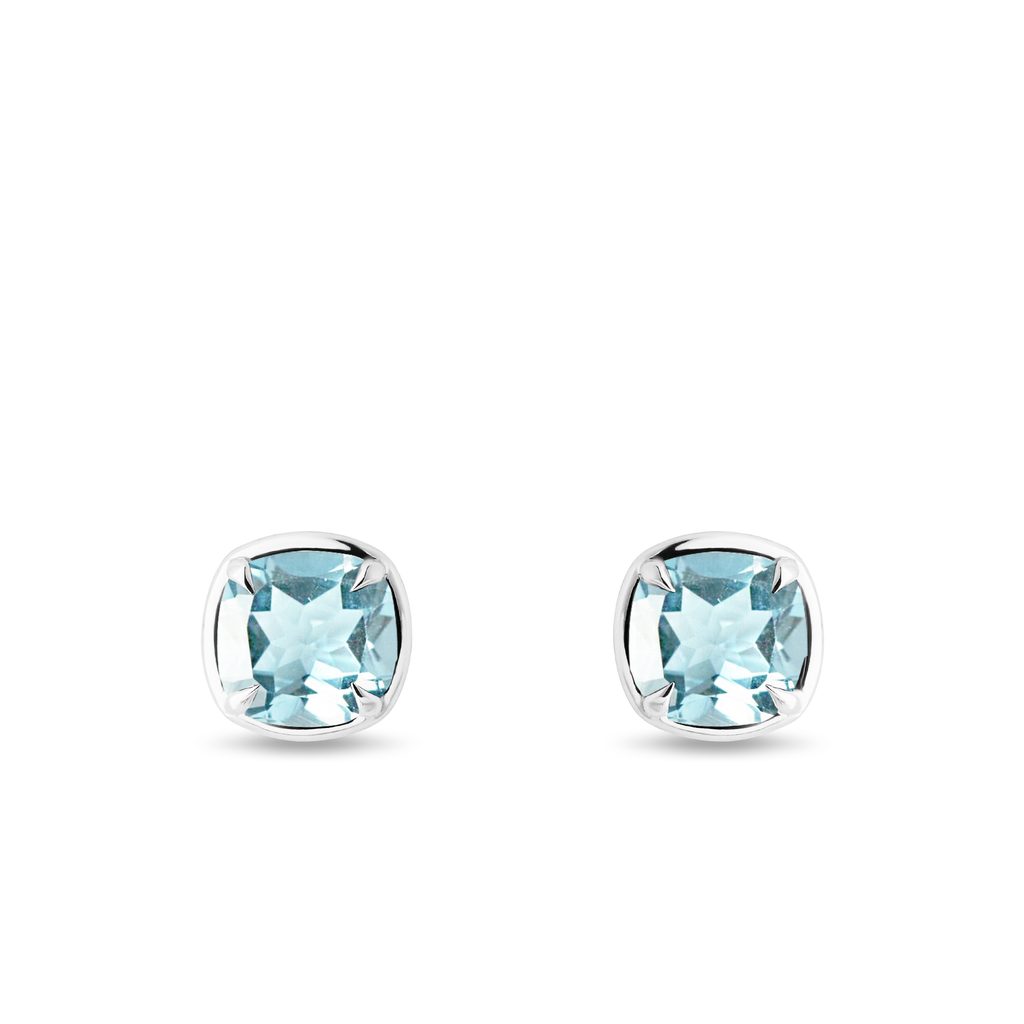 These distinctive stud earrings made of 14k white gold are decorated with light blue 6 x 6 mm topaz in a cushion cut. They are a unique accessory that is guaranteed to attract attention, both day-to-day and on special occasions.