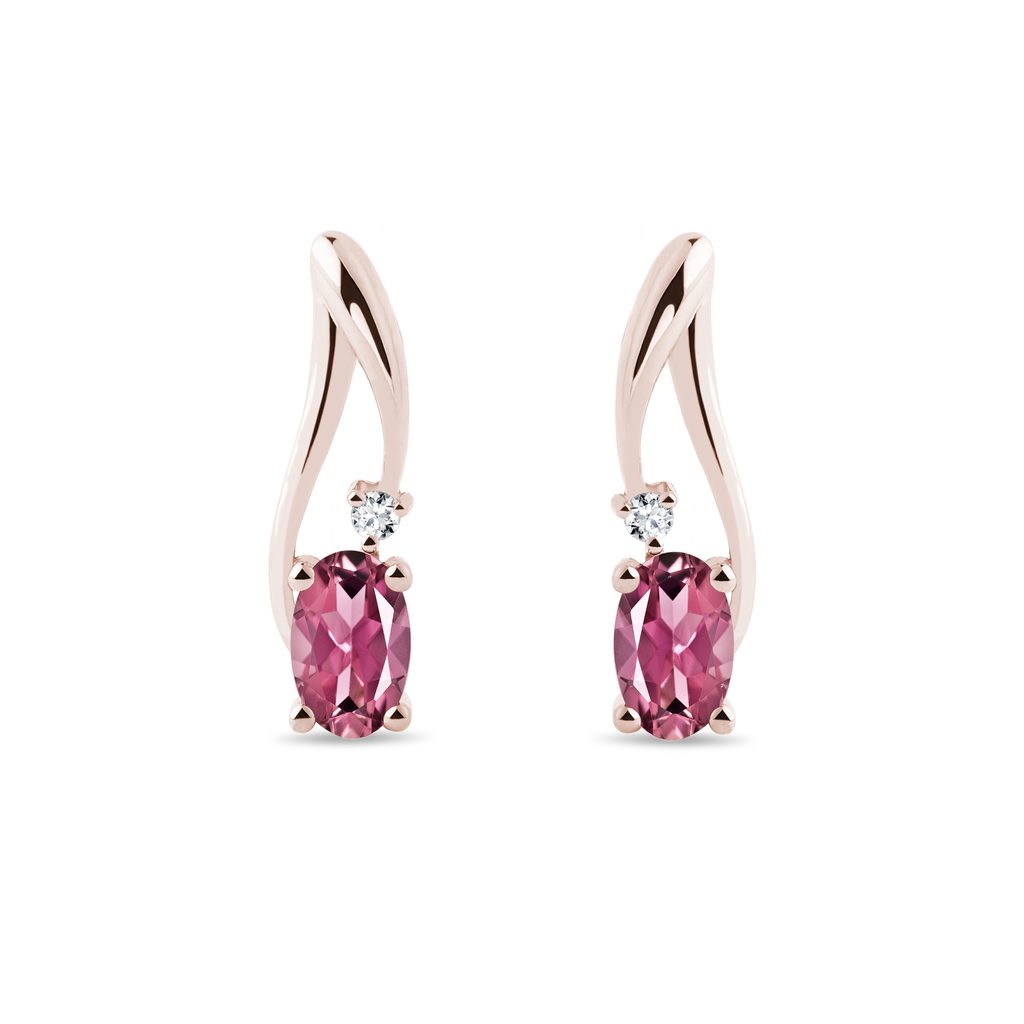 Earrings made of 14k rose gold and decorated with 5 mm tall pink tourmalines and brilliant diamonds. The rose gold combined with these tourmalines give these earrings a very gentle and feminine look. The interesting shape and style of these earrings makes them an accessory that nobody can overlook.