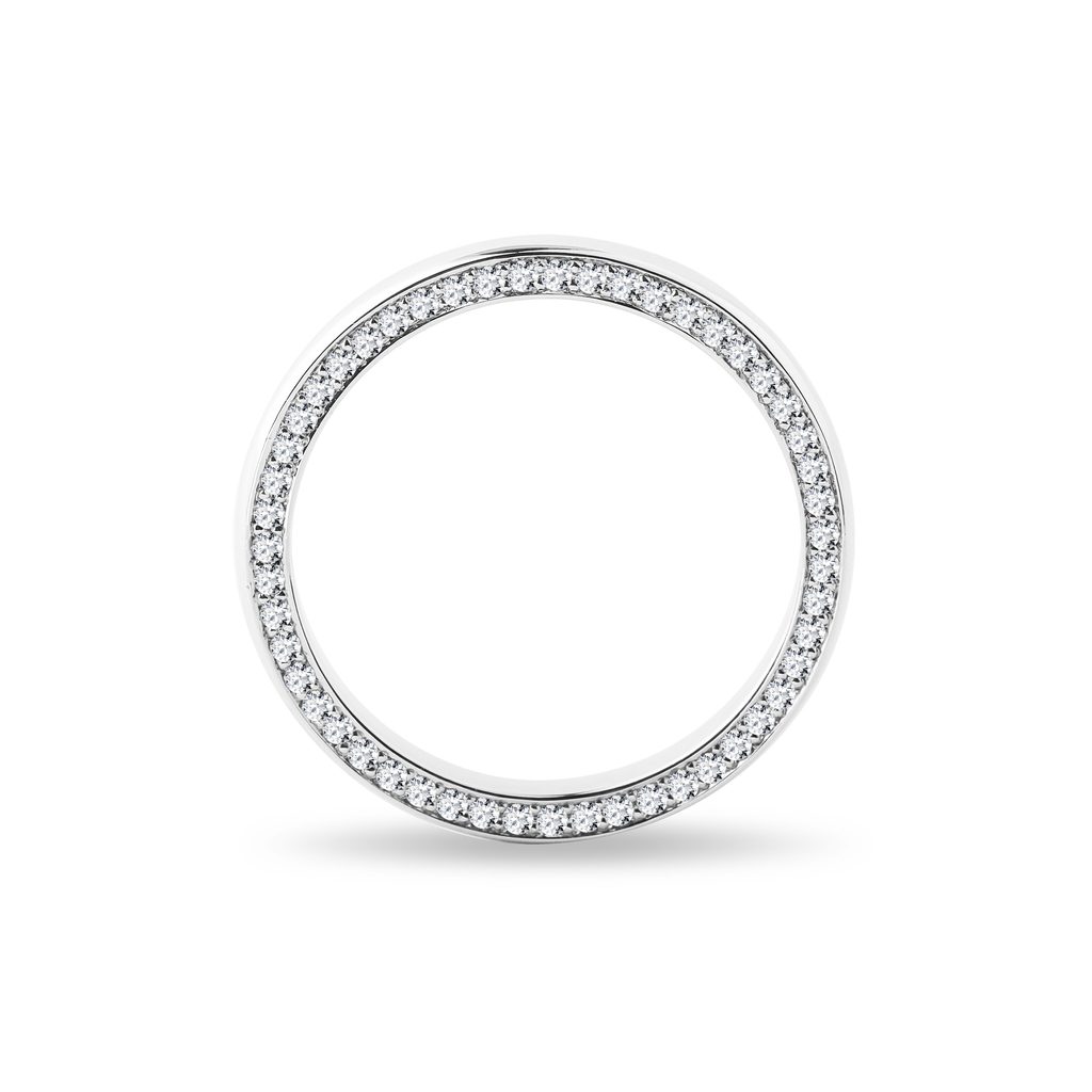 This 14k white gold women's wedding ring looks very elegant and feminine. The smooth and shiny 4mm band is discreetly lined on both sides with a channel setting of small clear diamonds that add a beautiful sparkle along with a slight touch of luxury to the ring. The perfect choice for ladies who love timeless classics with understated yet unmissable details.