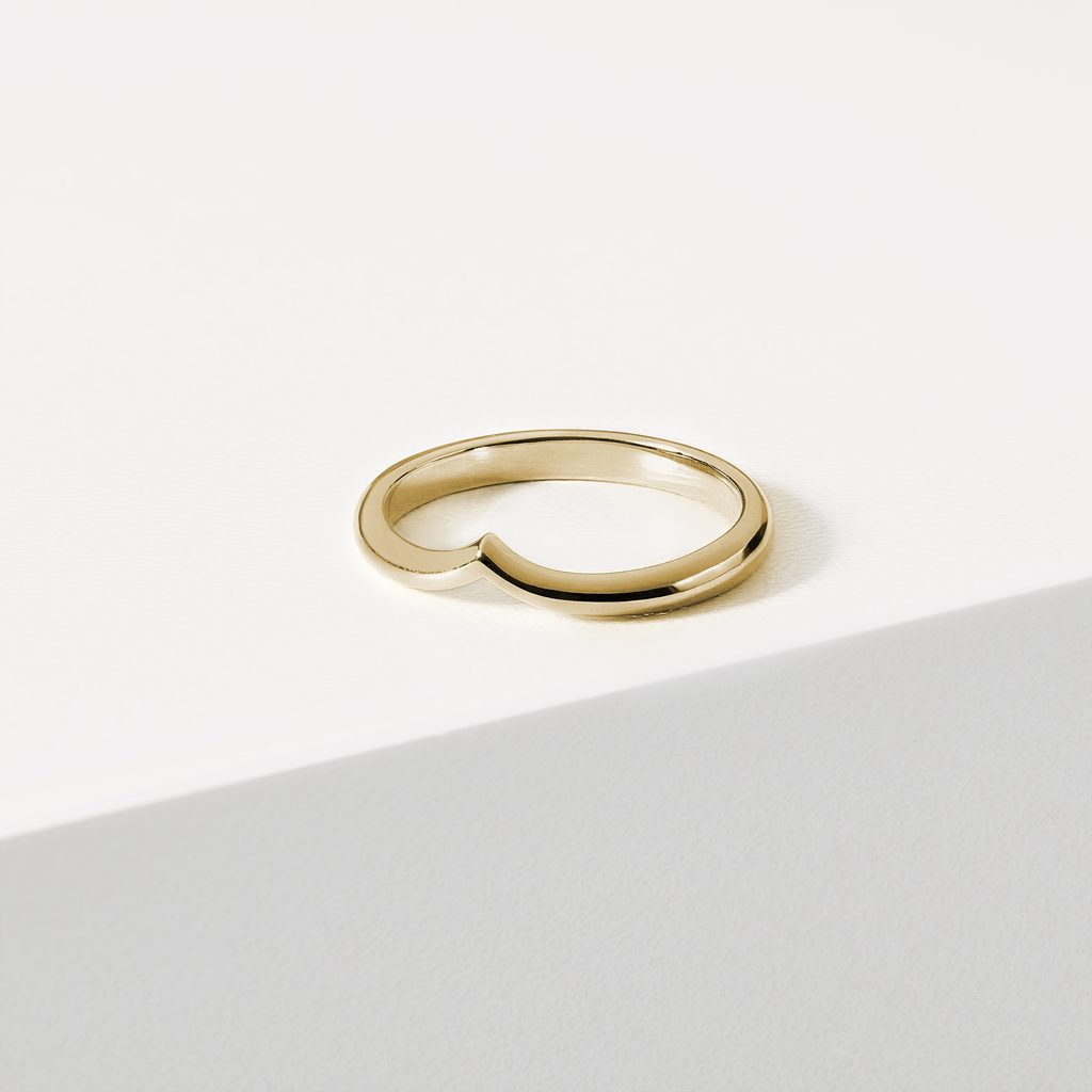 The pointed shape of this simple 14k yellow gold chevron ring is ideal for layering with gemstone rings. It also works beautifully as a wedding band that can be worn together with an engagement ring.