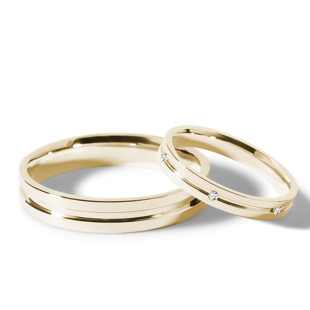 Wedding rings with engraved groove in yellow gold
