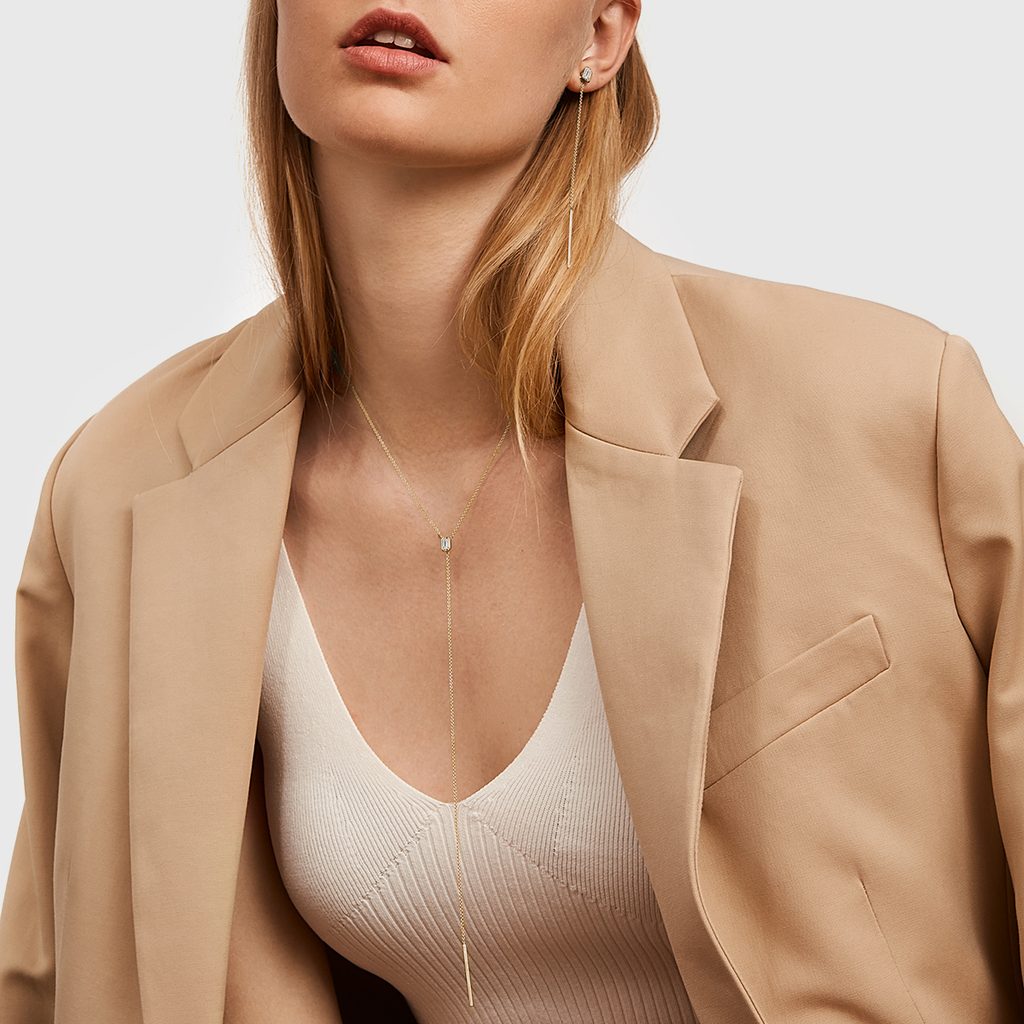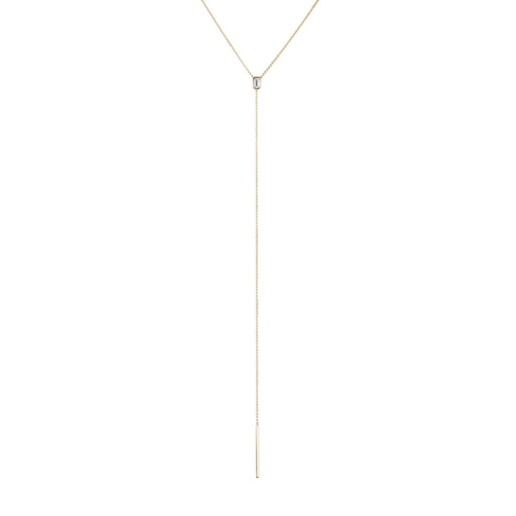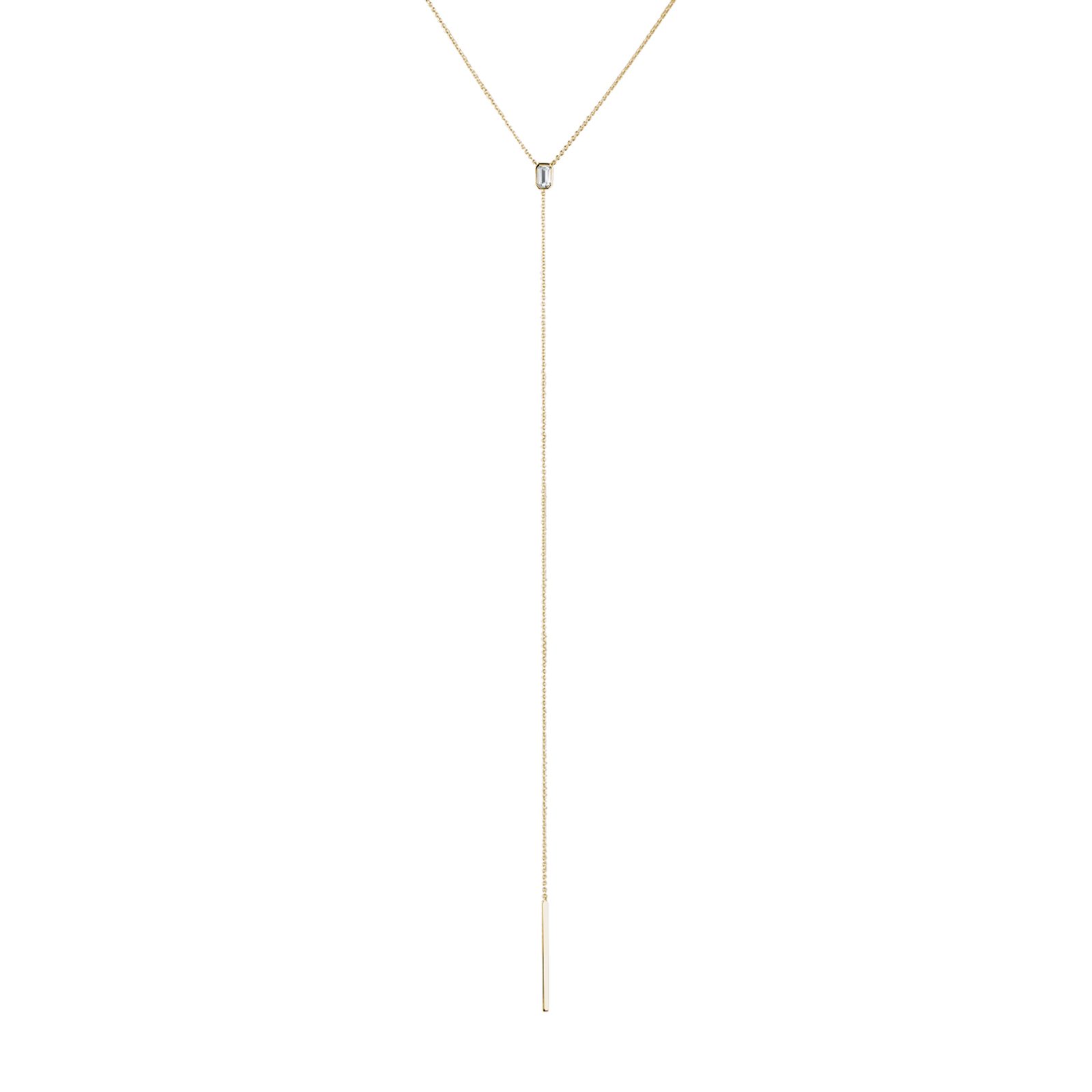 This modern chain necklace made of 14k yellow gold is decorated with a lab diamond set into a smooth metal band. The chain is 44 cm long while the hanging part of it is 19,5 cm long. This is an interesting piece of jewelry that will add an element of something special to an otherwise simple outfit.